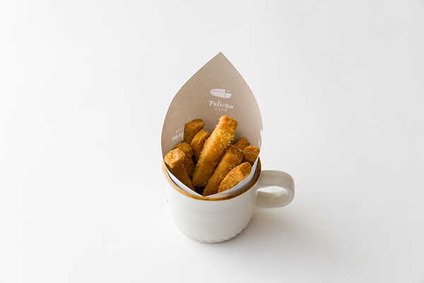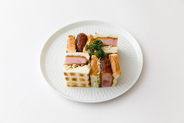 地元の「浅草ハム」を厚切りにして衣をつけて揚げ(パン粉もペリカンのパン)、千切りキャベツ、フレンチドレッシング、マスタードを挟みました。マヨネーズも自家製です。