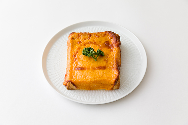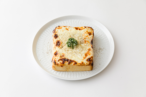 トーストしたパンにモッツァレラチーズ、フロマージュ・ブラン、パルミジャーノ・レッジャーノをかけて焼き上げました。