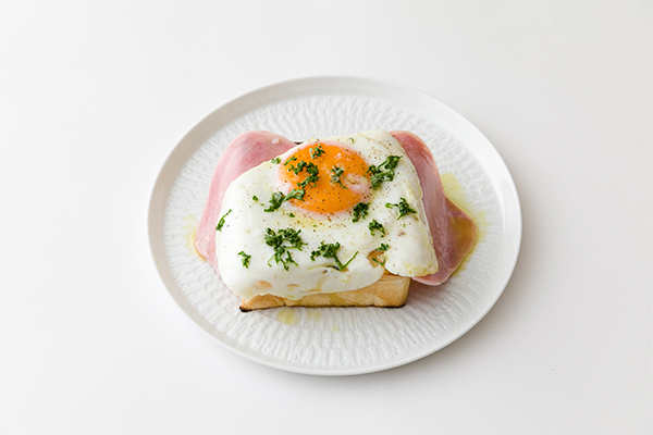 食パンに自家製マヨネーズを塗り、ハムをのせて焼き上げました。さらに半熟の目玉焼きを乗せました。