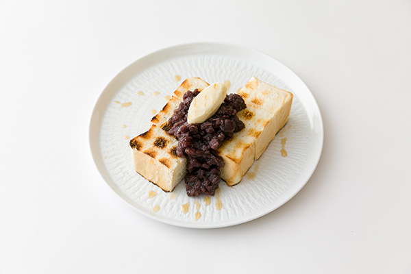 トーストに、丁寧に炊き上げた粒あんをたっぷりのせて、ホイップしたバターをのせ、上からメープルシロップをかけました。