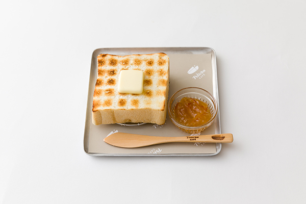 食パンを厚さ3cmに切り、特注の網にのせて、じっくり焼き上げました。外はカリッサクッ、中はもっちり。バターと特製ジャムを添えて。